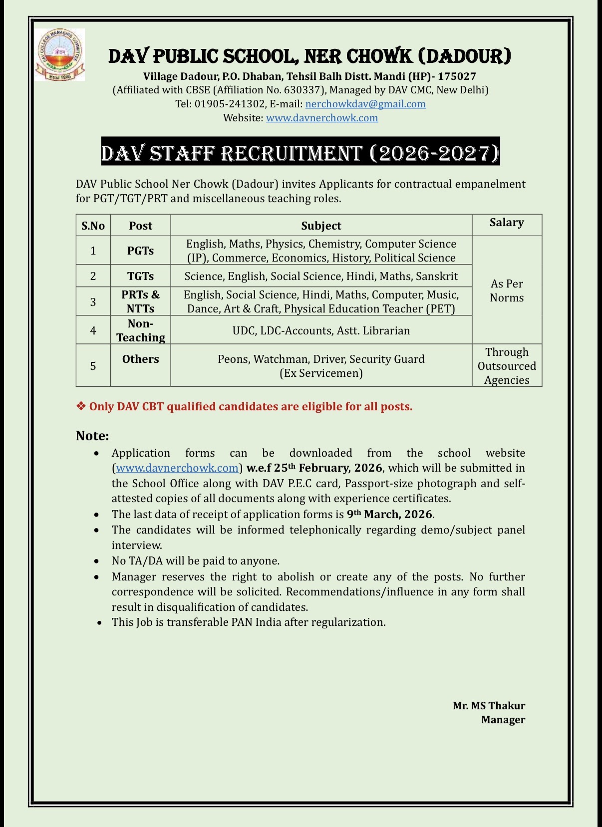 DAV PUBLIC SCHOOL Ner-Chowk, Dadour Post Office - Dhaban Distt. - Mandi, H.P. - 175027 Contact No. - 01905-241302 E-Mail - nerchowkdav@gmail.com Website - davnerchowkdadour.com